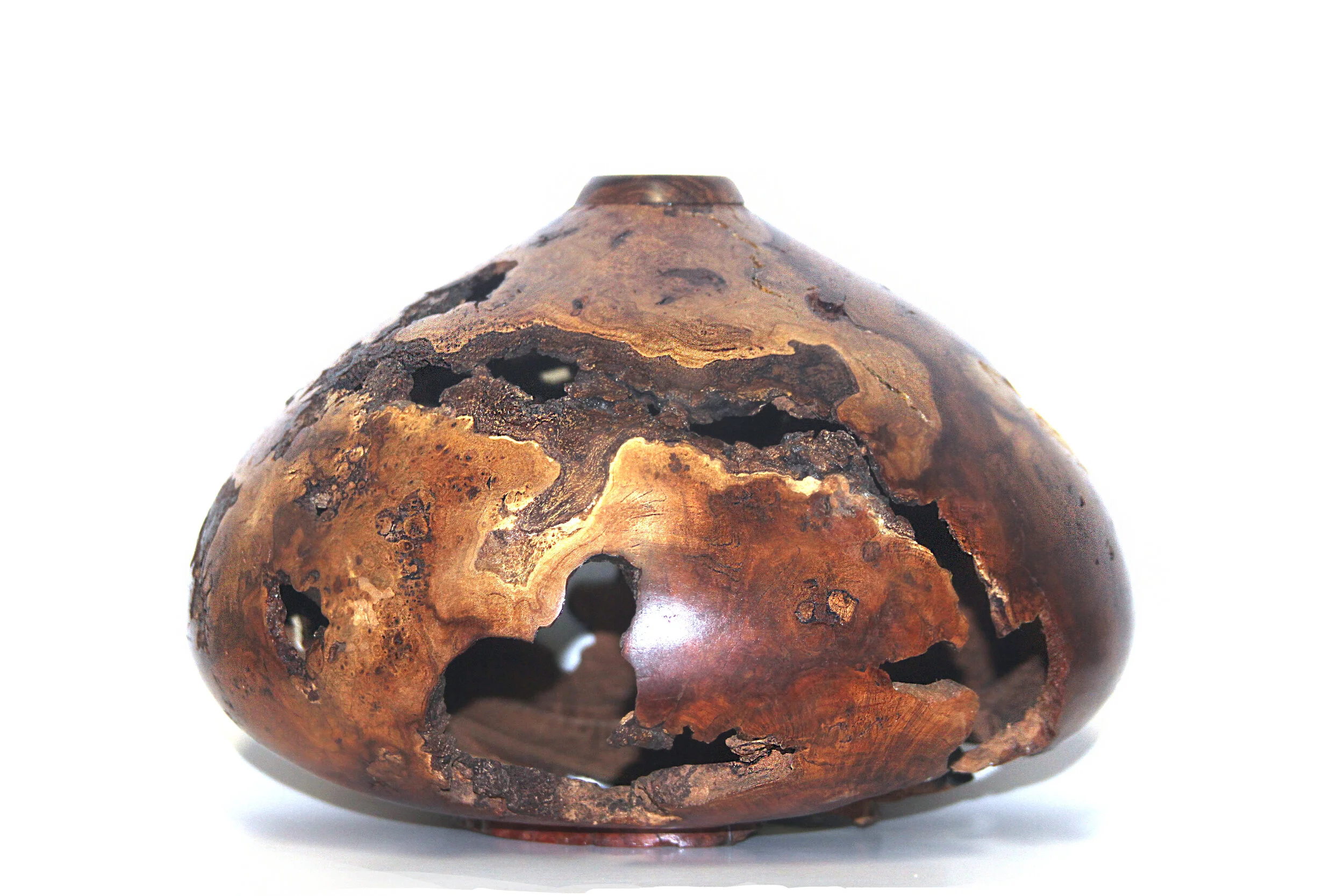 “Having been an arborist in the local area for fifty years, I have excellent sources of interesting woods. I primarily turn Cherry burl, figured Maple, Walnut and Yew. While in St. John I am lucky to have an array of very exotic woods: Lignum vitae, Cordia, “Monkey no climb” and many others.”